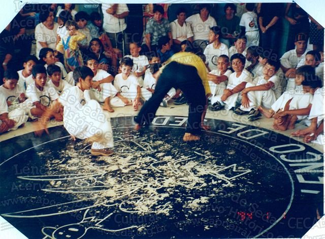 Congresso Regional de Capoeira zumbi 2000, promovido pela Associação de Capoeira Lenço de Seda. Na foto na sede do GRE os Bocas Brancas, centro Acesita – Timóteo. Alunos da Lenço apresentam show de Berimbau.